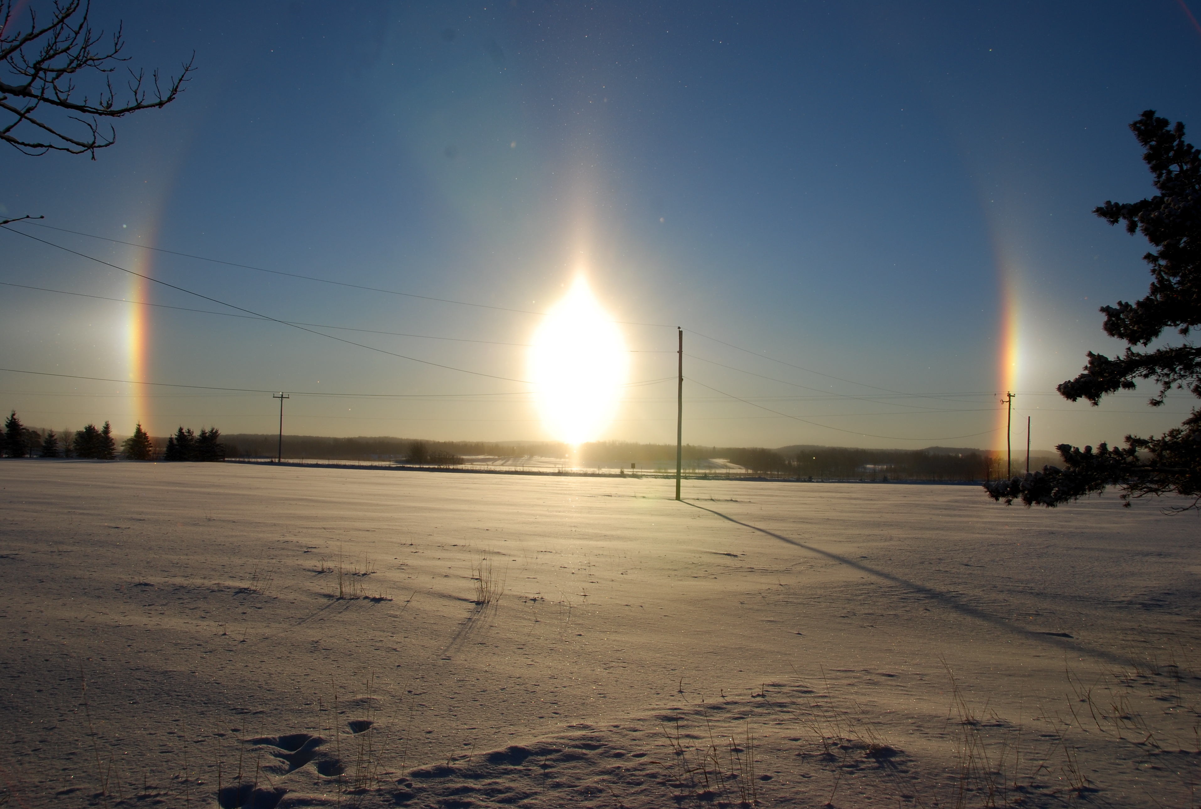 But here’s one of the payoffs for living in a winter country: sun dogs. Formed by sunlight being refracting through airborne ice crystals, these puppies seem to be rising, rainbow-like, right off the surface of the snow. (The photo doesn’t quite do them justice.)
