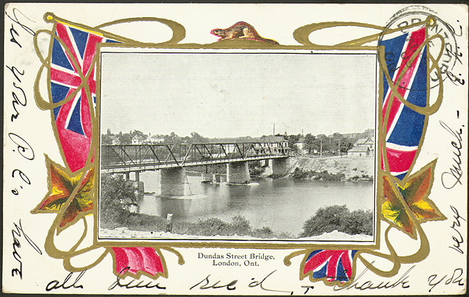 1910 postcard of London’s Dundas St. Bridge. Can you see the newly arrived European skippers?